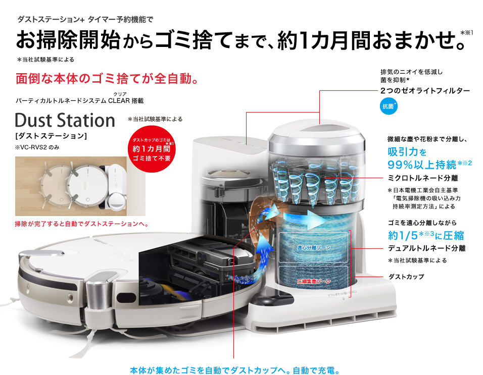 Đế sạc ("Trạm bụi") sử dụng cơ chế lốc xoáy 12 xi-lanh ("Hệ thống lốc xoáy dọc") được sử dụng trong máy làm sạch lốc xoáy không lọc được áp dụng.