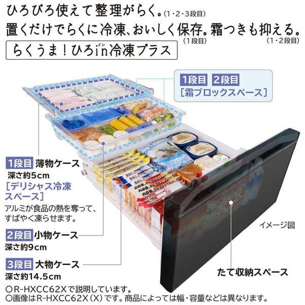 Tủ lạnh Hitachi R-HXC54X(X) được trang bị ngăn đông dung tích lớn 109L, thiết kế 3 tầng riêng biệt với chiều cao khác nhau, giúp phân loại thực phẩm đông lạnh dễ dàng: thịt cá, đồ đông sẵn, đá viên, kem…